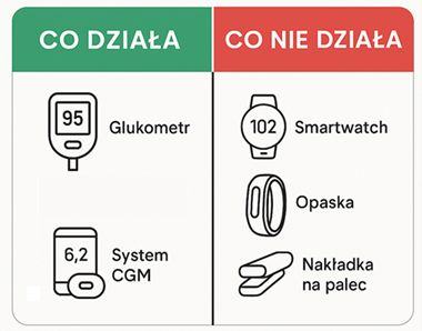 ✅ Obecnie nie istnieje żadne nieinwazyjne urządzenie mierzące glikemię, które byłoby równie dokładne jak glukometry czy systemy CGM.